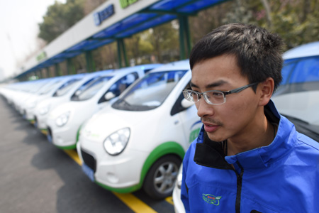 從3月16日起,杭州地鐵1號(hào)線(xiàn)江陵路站大型停車(chē)場(chǎng)內(nèi)的“微公交”純電動(dòng)汽車(chē)站點(diǎn)正式投入運(yùn)營(yíng)。這是目前杭州規(guī)模最大的“微公交”平面租賃站,可提供60輛微型純電動(dòng)汽車(chē)。杭州從2013年9月起試運(yùn)營(yíng)“微公交”,目前已有“微公交”純電動(dòng)汽車(chē)9851輛。圖為運(yùn)營(yíng)方一名工作人員站在“微公交”江陵路站內(nèi)。