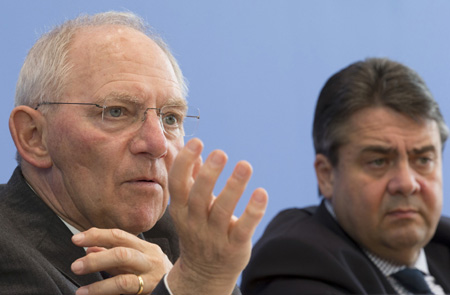3月18日,在德國柏林,德國財政部長朔伊布勒(左)和經(jīng)濟部長加布里爾出席新聞發(fā)布會。 德國政府18日公布了2016年財政預(yù)算草案及到2019年的中期財政計劃草案。草案指出,2016年德政府計劃擴大投資和支出,并將財政收支平衡目標(biāo)保持至2019年。