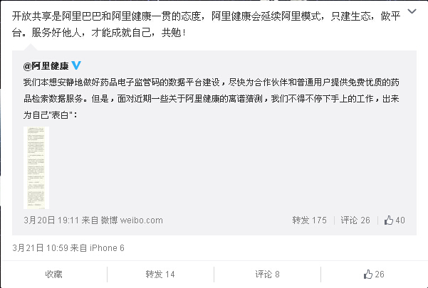 2015年3月21日,阿里巴巴官方微博轉(zhuǎn)發(fā)阿里健康官方認(rèn)證微博聲明表示,“開放共享是阿里巴巴和阿里健康一貫的態(tài)度,阿里健康會延續(xù)阿里模式,只建生態(tài),做平臺。服務(wù)好他人,才能成就自己,共勉”。而其轉(zhuǎn)發(fā)的阿里健康長微博內(nèi)容則稱,阿里健康是在國家食藥監(jiān)總局指導(dǎo)下,進(jìn)行中國藥品電子監(jiān)管碼的數(shù)據(jù)平臺建設(shè),并且正在按照食藥監(jiān)總局的要求,逐步開放免費(fèi)的數(shù)據(jù)服務(wù)。