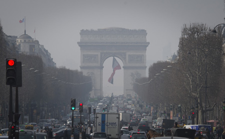 法國巴黎凱旋門被霧霾籠罩(3月20日攝)。 法國巴黎警察局3月23日在首都巴黎及周邊3個省份臨時采取車輛單雙號限行等緊急措施,應對空氣嚴重污染現(xiàn)象。近一周來,受無風無雨天氣影響,由道路交通、春季農作物播種施肥及工業(yè)生產等人類活動排放到大氣中的各類污染物難以驅散,造成巴黎大區(qū)及法國北部多處地區(qū)空氣質量明顯下降。