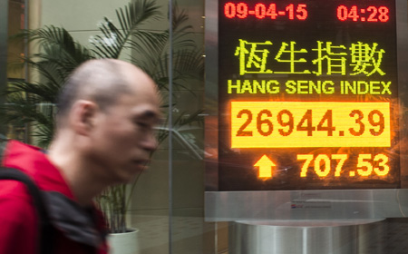 4月9日,一名行人從香港灣仔一家銀行的恒生指數(shù)電子顯示屏前走過(guò)。 當(dāng)日,港股承接強(qiáng)勢(shì),收市報(bào)26944.39點(diǎn),全日升707.53點(diǎn),升幅2.7%。主板成交再創(chuàng)歷史新高,達(dá)2915億港元!案酃赏ā眴稳疹~度再次用盡,比前一交易日提早23分鐘。