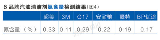 國家石油石化產(chǎn)品質(zhì)量監(jiān)督檢驗中心工程師楊明桂對此分析,6品牌汽油清潔劑的氮含量檢測結(jié)果均不錯,即使是測試結(jié)果最高的0.33%