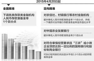 4月19日,央行宣布自20日起下調(diào)各類存款類金融機構(gòu)人民幣存款準備金率1個百分點。在此基礎(chǔ)上,為進一步增強金融機構(gòu)支持結(jié)構(gòu)調(diào)整的能力,加大對小微企業(yè)、“三農(nóng)”以及重大水利工程建設(shè)等的支持力度,自4月20日起對農(nóng)信社、村鎮(zhèn)銀行等農(nóng)村金融機構(gòu)額外降低人民幣存款準備金率1個百分點,并統(tǒng)一下調(diào)農(nóng)村合作銀行存款準備金率至農(nóng)信社水平;對中國農(nóng)業(yè)發(fā)展銀行額外降低人民幣存款準備金率2個百分點;對符合審慎經(jīng)營要求且“三農(nóng)”或小微企業(yè)貸款達到一定比例的國有銀行和股份制商業(yè)銀行可執(zhí)行較同類機構(gòu)法定水平低0.5個百分點的存款準備金率。