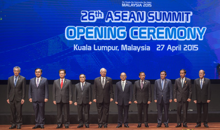 4月27日,在馬來西亞吉隆坡,與會領導人在東盟領導人會議開幕式上合影。當日,第26屆東盟領導人會議在馬來西亞吉隆坡開幕。會議的主要目標是確保東盟共同體在今年年底前如期建成,商討制定東盟在2015年后的發(fā)展愿景。