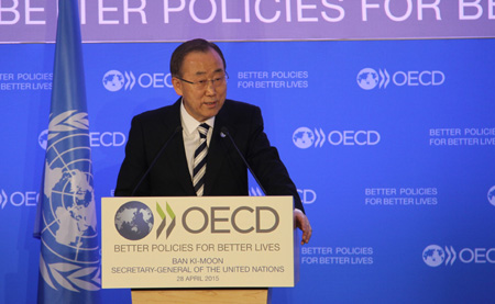 4月28日,聯(lián)合國(guó)秘書(shū)長(zhǎng)潘基文在經(jīng)濟(jì)合作與發(fā)展組織位于巴黎的總部發(fā)表演講。潘基文表示,現(xiàn)有的國(guó)際投融資機(jī)制已難以滿(mǎn)足各國(guó)可持續(xù)發(fā)展需要,國(guó)際社會(huì)應(yīng)加強(qiáng)合作,爭(zhēng)取達(dá)成新的協(xié)議,以改善現(xiàn)有的國(guó)際投融資機(jī)制,促進(jìn)可持續(xù)發(fā)展。