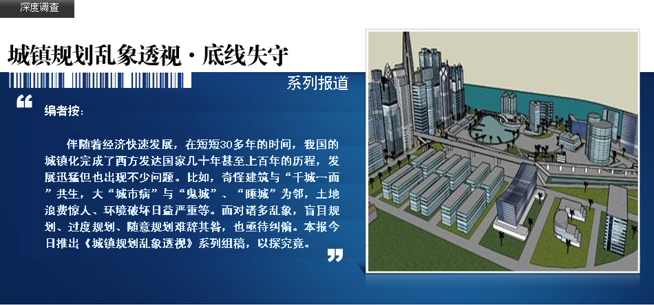 | 奇怪建筑與“千城一面”共生,大“城市病”與“鬼城”“睡城”為鄰,房地產(chǎn)過熱與土地大量出讓并存,土地浪費驚人、環(huán)境破壞日益嚴重、進城農民工生存困難,有些地區(qū)出現(xiàn)逆城市化趨勢……我國城鎮(zhèn)化在快速演進的過程中出現(xiàn)了諸多問題。專家表示,隨著我國經(jīng)濟社會進入新階段,常住人口城鎮(zhèn)化率超過50%,新型城鎮(zhèn)化戰(zhàn)略正式推進,城鎮(zhèn)化進入新的階段,城鎮(zhèn)規(guī)劃迫切需要轉型。 | |