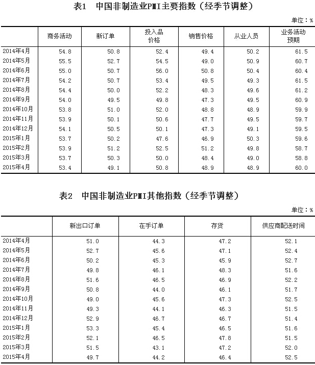 2015年4月,中國非制造業(yè)商務活動指數為53.4%,比上月小幅回落0.3個百分點,高于榮枯線3.4個百分點,表明我國非制造業(yè)繼續(xù)保持擴張狀態(tài),但增速略有放緩。