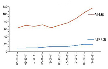 另一方面,單邊市場也是導致創(chuàng)業(yè)板估值不斷泡沫化的原因,目前,新基金正在大量的成立,百億元規(guī)模的基金也開始出現(xiàn),這使得基金經(jīng)理手中“彈藥”格外充足,在缺乏有力做空平衡工具的情況下,市場只能單邊上漲。WIND統(tǒng)計數(shù)據(jù)顯示,2015年3月,共有63只新基金發(fā)行,發(fā)行份額高達1795億份,到了4月份,新成立的基金達到了75只,發(fā)行份額搞到2193億份,而在2014年同期,這個數(shù)字只有25只和178億份。