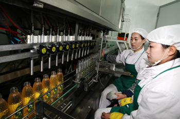 黑龍江青岡縣用活當(dāng)?shù)赜衩踪Y源,引進(jìn)年產(chǎn)值超30億元的龍鳳玉米開發(fā)有限公司,解決了當(dāng)?shù)赜衩卒N售之困,為農(nóng)戶提供再就業(yè)機會。圖為該公司生產(chǎn)線正在生產(chǎn)玉米胚芽油。(資料照片) |