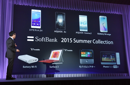 19日,在日本東京,日本軟銀移動公司總裁兼首席執(zhí)行官宮內(nèi)謙在新聞發(fā)布會上介紹產(chǎn)品。 當(dāng)日,為迎接2015夏季銷售,軟銀公司發(fā)布了新產(chǎn)品和服務(wù)項目。