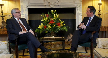 英國首相卡梅倫(右)25日在位于英格蘭白金漢郡的首相鄉(xiāng)間別墅會見歐盟委員會主席容克,討論歐盟改革和英歐關(guān)系問題。