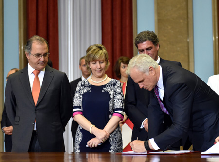 葡萄牙政府24日在首都里斯本與大西洋門戶聯(lián)合公司正式簽署葡萄牙航空股份轉(zhuǎn)讓協(xié)議,葡航空終于完成私有化改革。圖為當日美籍巴西企業(yè)家大衛(wèi)·尼爾曼(右)與葡萄牙財長阿爾布克爾克(中)和經(jīng)濟部長利馬出席簽字儀式。