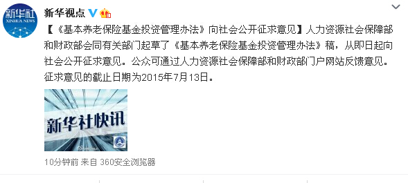據(jù)新華視點微博消息,人力資源社會保障部和財政部會同有關部門起草了《基本養(yǎng)老保險基金投資管理辦法》稿,從即日起向社會公開征求意見。公眾可通過人力資源社會保障部和財政部門戶網(wǎng)站反饋意見。征求意見的截止日期為2015年7月13日。