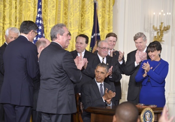 6月29日,在美國首都華盛頓白宮,美國總統(tǒng)奧巴馬在簽署法案后鼓掌。 新華社記者