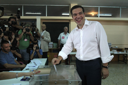 7月5日,在希臘雅典,希臘總理齊普拉斯在一家投票站投票。 希臘5日舉行全民公決,以決定是否接受債權人早先提出的協(xié)議草案,這將對如何解決希臘債務危機乃至希臘的歐元區(qū)地位產生重要影響。公決初步結果擬于當晚宣布。