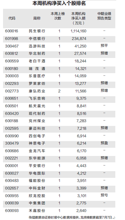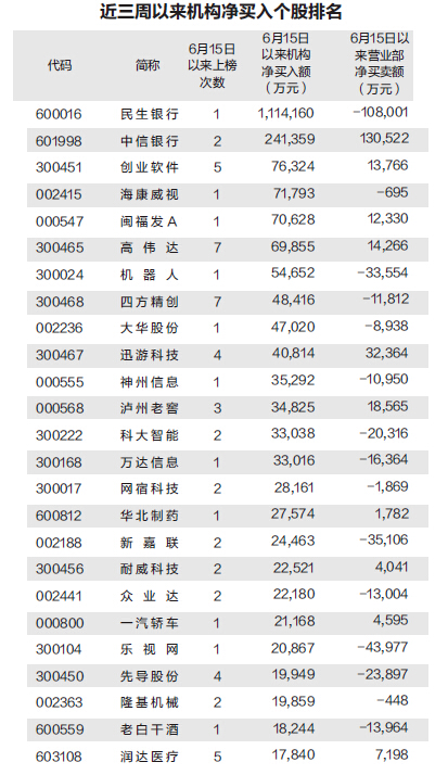 跟隨“國家隊”腳步,本周以來機構(gòu)席位護盤力度不斷加強。若從機構(gòu)凈買入額看,以銀行股為代表的藍籌股獲得機構(gòu)大手筆買入。比如民生銀行,不論從近三周還是本周來看,都是機構(gòu)凈買入額最大的個股。本周二,民生銀行現(xiàn)身龍虎榜,買入榜單中前四席位均被機構(gòu)占據(jù),賣出方中,僅有一家機構(gòu)席位現(xiàn)身,機構(gòu)席位合計凈買入111億元。近三周來,機構(gòu)凈買入金額排名第二位是中信銀行,本周和上周各上榜一次,機構(gòu)席位合計凈買入24億元。(陳文彬)
