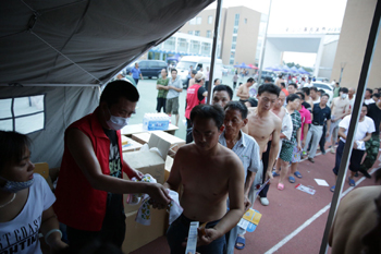 ??? 8月13日,應(yīng)急疏散的群眾在天津濱海新區(qū)開發(fā)區(qū)第二小學(xué)安置點領(lǐng)取生活用品。記者 才揚 攝 |