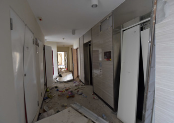 8月13日拍攝的爆炸地點(diǎn)附近的萬(wàn)科清水藍(lán)灣小區(qū)受損情況,電梯和門(mén)已經(jīng)被毀壞?!⌒氯A社記者 岳月偉/攝 |