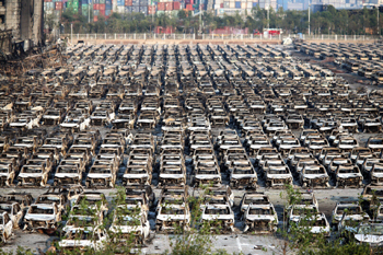 8月13日,在天津海濱爆炸現(xiàn)場(chǎng),數(shù)千輛車(chē)輛被燒毀,損失巨大?!⌒氯A社記者 才揚(yáng)/攝 |