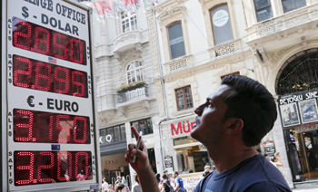 8月18日,在土耳其伊斯坦布爾,一名男子注視匯率顯示屏。土耳其里拉對(duì)美元匯率18日再創(chuàng)歷史新低,跌至1美元兌換2.906里拉。自今年初迄今,里拉對(duì)美元貶值約20%,為貶值最嚴(yán)重的新興市場(chǎng)貨幣之一。同日,土耳其中央銀行決定,維持今年5月以來(lái)的利率水平?!⌒氯A社/歐新中文 |