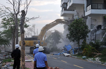 ??? 7月7日,海南省三亞市崖州區(qū)依法拆除位于該區(qū)現(xiàn)代農(nóng)業(yè)科教園科研用地內(nèi)的違法建筑“金陽光溫泉花園”。據(jù)了解,“金陽光溫泉花園”所在地原本規(guī)劃為農(nóng)業(yè)項(xiàng)目的科研用地,在兩年時間內(nèi)“瘋長”出17幢違法建筑,并向購房者銷售了1000多套商品住房。 新華社發(fā)(楊冠宇 攝) |