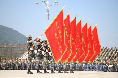 為鮮明地表達(dá)紀(jì)念抗戰(zhàn)勝利這個(gè)主題,閱兵領(lǐng)導(dǎo)小組和聯(lián)合指揮部研究決定,由受閱部隊(duì)擎舉抗戰(zhàn)部隊(duì)番號(hào)旗和榮譽(yù)旗在天安門前接受檢閱。盧少澤介紹,70面旗幟,寓意紀(jì)念中國(guó)人民抗日戰(zhàn)爭(zhēng)暨世界反法西斯戰(zhàn)爭(zhēng)勝利70周年。其中,10面為抗戰(zhàn)部隊(duì)番號(hào)旗,60面為抗戰(zhàn)部隊(duì)榮譽(yù)旗;每個(gè)英模部隊(duì)方隊(duì)前,1面為番號(hào)旗,6面為榮譽(yù)旗。