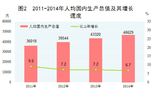 人均國內(nèi)生產(chǎn)總值穩(wěn)步提高。2014年,我國人均國內(nèi)生產(chǎn)總值46629元,扣除價(jià)格因素,比2010年增長33.6%,年均實(shí)際增長7.5%。根據(jù)世界銀行數(shù)據(jù),我國人均國民總收入由2010年的4300美元提高至2014年的7380美元,在上中等收入國家中的位次不斷提高。