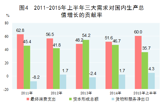 內(nèi)需特別是消費(fèi)對經(jīng)濟(jì)增長貢獻(xiàn)明顯增強(qiáng)。在擴(kuò)大內(nèi)需戰(zhàn)略的帶動(dòng)下,消費(fèi)的基礎(chǔ)性作用和投資的關(guān)鍵性作用得到較好發(fā)揮,特別是消費(fèi)結(jié)構(gòu)升級帶動(dòng)居民消費(fèi)潛力有序釋放,消費(fèi)成為拉動(dòng)經(jīng)濟(jì)增長的主動(dòng)力。2011-2014年,最終消費(fèi)對經(jīng)濟(jì)增長的年均貢獻(xiàn)率為54.8%,高于投資貢獻(xiàn)率7.8個(gè)百分點(diǎn)。2015年上半年,消費(fèi)對經(jīng)濟(jì)增長的貢獻(xiàn)率上升為60%。