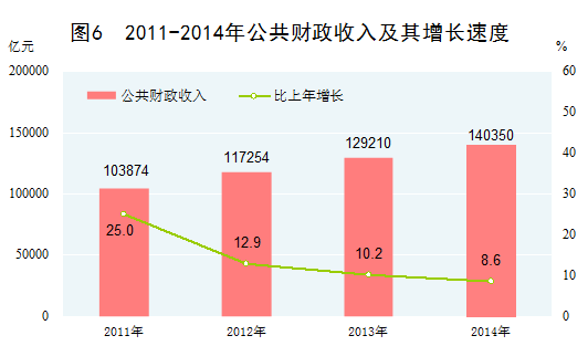 國家財(cái)政實(shí)力明顯增強(qiáng)。2011年,我國公共財(cái)政收入突破10萬億元大關(guān),2014年超過14萬億元,比2010年增長68.9%,年均增長14.0%。隨著國家財(cái)政實(shí)力增強(qiáng),財(cái)政對經(jīng)濟(jì)社會(huì)發(fā)展的支持不斷加大。2014年,我國公共財(cái)政支出超過15萬億元,比2010年增長68.7%。重點(diǎn)領(lǐng)域民生支出得到較好保障。2011-2014年,城鄉(xiāng)社區(qū)事務(wù)、醫(yī)療衛(wèi)生、交通運(yùn)輸、教育、社會(huì)保障和就業(yè)支出年均分別增長21.1%、20.4%、17.2%、16.2%和14.9%。