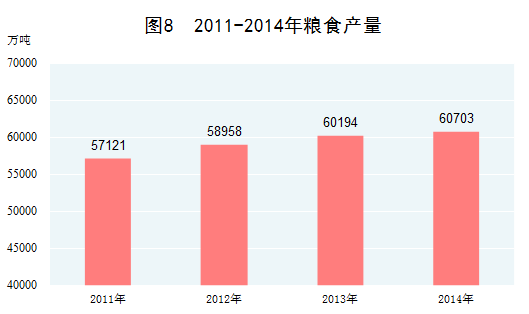 農(nóng)業(yè)基礎(chǔ)進(jìn)一步鞏固。2014年,糧食總產(chǎn)量取得歷史性突破,達(dá)到60703萬噸,比2010年增長11.1%,年均增長2.7%,實(shí)現(xiàn)“十一連增”。近年來,我國谷物、肉類、籽棉、花生、茶葉、水果等農(nóng)產(chǎn)品產(chǎn)量穩(wěn)居世界第一位。