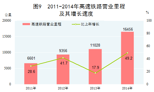 交通運(yùn)輸能力持續(xù)增強(qiáng)。高效、便捷的鐵路網(wǎng)、公路網(wǎng)、航空運(yùn)輸網(wǎng)、城際鐵路網(wǎng)、航道網(wǎng)逐漸形成。2014年末,鐵路營業(yè)里程、公路里程、高速公路里程、定期航班航線里程分別達(dá)到11.2萬公里、446.4萬公里、11.2萬公里、463.7萬公里,分別比2010年末增長22.6%、11.4%、51.0%、67.7%。特別是,高速鐵路迎來了史無前例的大發(fā)展,2014年高速鐵路運(yùn)營里程突破1.6萬公里,位居世界第一,我國高鐵還駛出國門,參與多國鐵路建設(shè),成為獨(dú)具特色、彰顯國力的中國名片。