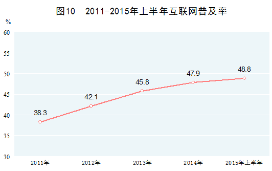 信息通信發(fā)展水平快速提高。2014年,我國郵電業(yè)務(wù)總量21846億元(按2010年不變價(jià)格計(jì)算),比2010年增長90.4%,年均增長17.5%。移動(dòng)互聯(lián)網(wǎng)產(chǎn)業(yè)方興未艾,“寬帶中國”戰(zhàn)略加快實(shí)施。2014年末,移動(dòng)電話用戶、互聯(lián)網(wǎng)上網(wǎng)人數(shù)分別達(dá)到12.9億戶、6.5億人,分別比2010年增長49.7%、41.9%;移動(dòng)電話普及率、互聯(lián)網(wǎng)普及率分別達(dá)到94.5部/百人、47.9%,分別比2010年提高30.1部/百人、13.6個(gè)百分點(diǎn)。