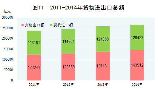進(jìn)出口貿(mào)易規(guī)模穩(wěn)步擴(kuò)大。盡管國際金融危機(jī)以來世界經(jīng)濟(jì)復(fù)蘇步履蹣跚,但由于黨中央國務(wù)院積極應(yīng)對,我國進(jìn)出口貿(mào)易總體上保持了穩(wěn)定增長,占國際貿(mào)易的份額繼續(xù)上升。2014年,我國貨物進(jìn)出口總額達(dá)到26.4萬億元,居世界第一位,比2010年增長31.0%,年均增長7.0%。貨物進(jìn)出口總額占世界貿(mào)易總額的比重為11.3%,比2010年提高1.7個(gè)百分點(diǎn)。