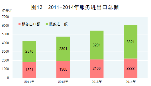 服務(wù)貿(mào)易取得長足發(fā)展。2014年,服務(wù)進(jìn)出口總額達(dá)到6043億美元,比2010年增長66.7%,年均增長13.6%。服務(wù)貿(mào)易結(jié)構(gòu)逐步優(yōu)化,計(jì)算機(jī)、保險(xiǎn)、金融、咨詢等高附加值服務(wù)貿(mào)易出口增長勢頭強(qiáng)勁。