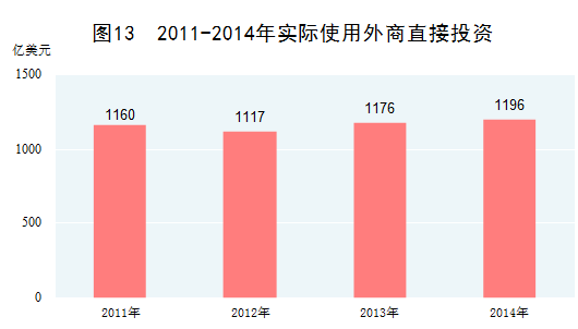 利用外資規(guī)模躍居世界第一。利用外資從追求量的擴(kuò)大轉(zhuǎn)向質(zhì)的提高。2011-2014年,我國累計(jì)實(shí)際使用外商直接投資4649億美元,年均增長3.1%,其中,2014年實(shí)際使用外商直接投資1196億美元,首次躍居全球第一。外商投資領(lǐng)域也從一般制造業(yè)向高技術(shù)產(chǎn)業(yè)和金融、保險(xiǎn)等服務(wù)業(yè)拓展。