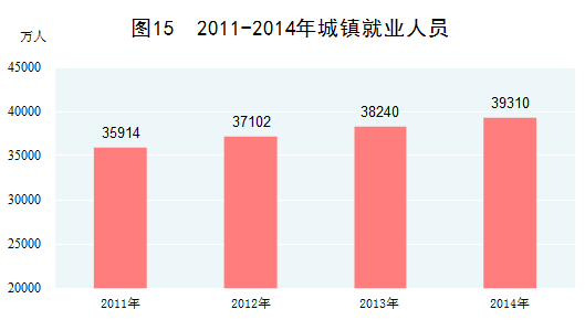 就業(yè)穩(wěn)步增加。高度重視就業(yè)工作,以改革促進(jìn)大眾創(chuàng)業(yè)、萬眾創(chuàng)新,在經(jīng)濟(jì)增速放緩的背景下就業(yè)總量不降反升。2014年末,全國就業(yè)人員達(dá)到77253萬人,比2010年末增加1148萬人。其中,城鎮(zhèn)就業(yè)人員增加到39310萬人,占全部就業(yè)人員的比重為50.9%,比2010年末提高5.3個(gè)百分點(diǎn)。2014年農(nóng)民工總量為27395萬人,比2010年增長13.1%,年均增長3.1%。2015年上半年新增就業(yè)718萬人,完成全年目標(biāo)的71.8%。