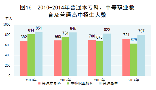 教育事業(yè)成績顯著。2014年,小學(xué)學(xué)齡兒童凈入學(xué)率達(dá)到99.8%;中等職業(yè)教育招生629萬人,在校生1803萬人,畢業(yè)生633萬人;全國普通本專科招生721萬人,在校生2548萬人,畢業(yè)生659萬人,分別比2010年增加60萬人、316萬人、84萬人;高等教育毛入學(xué)率達(dá)到37.5%,比2010年提高11個(gè)百分點(diǎn)。