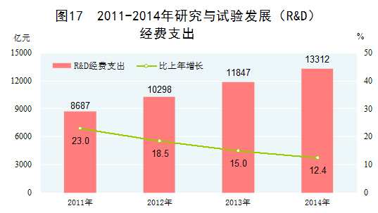 科技事業(yè)成果豐碩。2014年,研究與試驗(yàn)發(fā)展(R&D)經(jīng)費(fèi)支出13312億元,比2010年增長88.5%,占國內(nèi)生產(chǎn)總值的比重為2.09%,比2010年提高0.36個(gè)百分點(diǎn)。專利申請量和授權(quán)量大幅增加。2014年,受理境內(nèi)外專利申請236萬件,授予專利權(quán)130萬件,分別比2010年增長93.2%和59.9%?;A(chǔ)研究和前沿技術(shù)研究取得一批重大成果,探月工程、載人深潛、衛(wèi)星應(yīng)用、超級計(jì)算等重大科研項(xiàng)目取得新突破,為產(chǎn)業(yè)轉(zhuǎn)型升級提供了強(qiáng)有力的技術(shù)支撐。