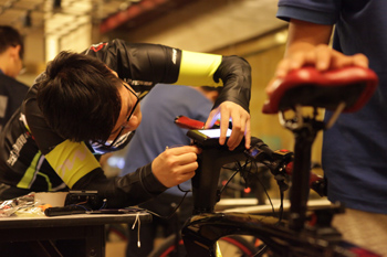近日,樂視體育的工程師在調(diào)試由樂視體育和天津飛鴿自行車廠合作研發(fā)生產(chǎn)的“超級自行車”?! ⌒氯A社發(fā) |