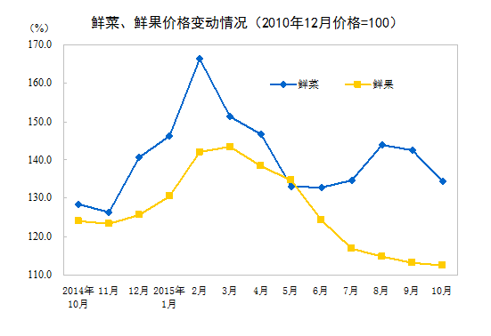 2015年10月份,全國(guó)居民消費(fèi)價(jià)格總水平同比上漲1.3%。其中,城市上漲1.3%,農(nóng)村上漲1.2%;食品價(jià)格上漲1.9%,非食品價(jià)格上漲0.9%;消費(fèi)品價(jià)格上漲1.0%,服務(wù)價(jià)格上漲1.9%。1-10月平均,全國(guó)居民消費(fèi)價(jià)格總水平比去年同期上漲1.4%。