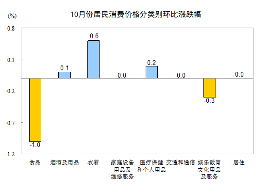 10月份,全國(guó)居民消費(fèi)價(jià)格總水平環(huán)比下降0.3%。其中,城市下降0.3%,農(nóng)村下降0.3%;食品價(jià)格下降1.0%,非食品價(jià)格上漲0.1%;消費(fèi)品價(jià)格下降0.4%,服務(wù)價(jià)格下降0.1%。