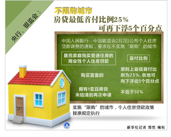 ??? 央行網站2日頒布《關于調整個人住房貸款政策有關問題的通知》,指出在不實施“限購”措施的城市,居民家庭首次購買普通住房的商業(yè)性個人住房貸款,原則上最低首付款比例為25%,各地可向下浮動5個百分點。對擁有1套住房且相應購房貸款未結清的居民家庭,為改善居住條件再次申請商業(yè)性個人住房貸款購買普通住房,最低首付款比例調整為不低于30%。