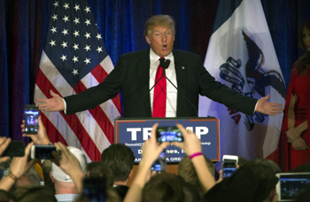 2月1日,美國共和黨總統(tǒng)候選人唐納德·特朗普在美國艾奧瓦州錫達拉皮茲參加競選活動。美國中西部的艾奧瓦州1日晚舉行2016年總統(tǒng)選舉首場黨內(nèi)預(yù)選,打響今年美國總統(tǒng)大選的第一槍?!⌒氯A社/歐新中文? |
