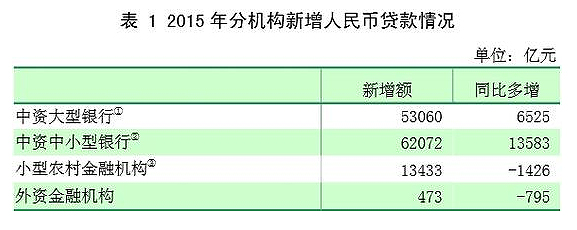 2015年末,金融機(jī)構(gòu)本外幣貸款余額為99.3萬(wàn)億元,同比增長(zhǎng)13.4%,與上年末基本持平,比年初增加11.7萬(wàn)億元,同比多增1.3萬(wàn)億元。人民幣貸款余額為94.0萬(wàn)億元,同比增長(zhǎng) 14.3%,比上年末高0.6個(gè)百分點(diǎn),比年初增加11.7萬(wàn)億元,同比多增1.8萬(wàn)億元。從人民幣貸款部門分布來(lái)看,住戶貸款、非金融企業(yè)及機(jī)關(guān)團(tuán)體貸款增長(zhǎng)略有加快,非銀行業(yè)金融機(jī)構(gòu)貸款增多。2015年末,住戶貸款余額為27.0萬(wàn)億元,同比增長(zhǎng) 16.8%,增速比上年末高0.2個(gè)百分點(diǎn),比年初增加3.9萬(wàn)億元,同比多增5814億元。其中,個(gè)人住房貸款比年初增加2.5萬(wàn)億元,同比多增9250億元。非金融企業(yè)及機(jī)關(guān)團(tuán)體貸款余額為65.8萬(wàn)億元,同比增長(zhǎng)12.7%,增速比上年末高0.2個(gè)百分點(diǎn),比年初增加7.4萬(wàn)億元,同比多增8987億元。非銀行業(yè)金融機(jī)構(gòu)貸款余額為8539億元,同比增長(zhǎng) 66.9%,比年初增加3767億元,同比多增2605億元。從期限看,中長(zhǎng)期貸款比年初增加6.7萬(wàn)億元,同比多增6332億元,增量占比為57.1%。包含票據(jù)融資在內(nèi)的短期貸款比年初增加4.7萬(wàn)億元,同比多增1.2萬(wàn)億元;其中,票據(jù)融資比年初增加1.7萬(wàn)億元,同比多增7062億元。分機(jī)構(gòu)看,中資大型銀行和中資中小型銀行貸款同比多增較多。