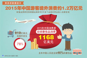 火爆的出境游帶動了海外消費(fèi)。國家旅游局?jǐn)?shù)據(jù)顯示,2015年,中國出境旅游達(dá)1.2億人次,出境人次和消費(fèi)均列世界第一。商務(wù)部數(shù)據(jù)顯示,2015年中國游客在境外消費(fèi)約1.2萬億元,繼續(xù)保持世界主要旅游消費(fèi)群體稱號。