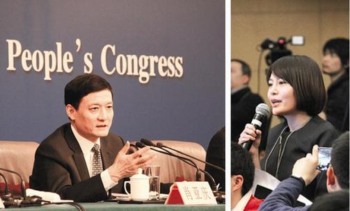 3月12日,十二屆全國人大四次會議新聞中心舉行記者會。國資委主任肖亞慶(左圖)在回答《經(jīng)濟(jì)參考報》記者楊燁(右圖)提問時表示,去年央企整體利潤為6.9%的負(fù)增長。在經(jīng)濟(jì)下行壓力下,今年以來,央企將壓力轉(zhuǎn)化為動力,1至2月份,央企利潤增長了4.7%。他說,央企今年的情況相對穩(wěn)定,各個央企在穩(wěn)增長和提效益方面也做了大量工作。不過,從部分行業(yè)目前所處的狀況來看,恐慌心理比下行壓力更可怕,并有可能帶來更大的下行。我國市場很大,關(guān)鍵是從央企開始,振奮精神,真抓實干,要把產(chǎn)品質(zhì)量提高,把成本降下來。????本報記者 張莫 攝