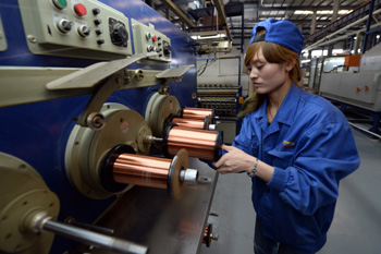 3月23日,在白銀有色長通電線電纜有限責(zé)任公司生產(chǎn)車間,工人從漆包機(jī)上取下超微細(xì)電磁線軸。 新華社記者 范培珅/攝 |