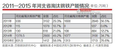 2016年2月4日,國務(wù)院發(fā)布《關(guān)于鋼鐵行業(yè)化解過剩產(chǎn)能實現(xiàn)脫困發(fā)展的意見》。意見明確,從2016年開始,在近年來淘汰落后鋼鐵產(chǎn)能的基礎(chǔ)上,用5年時間再壓減粗鋼產(chǎn)能1億~1.5億噸。蘭格鋼鐵研究中心研究員徐莉穎向《中國經(jīng)濟周刊》記者介紹,截至2015年底,河北省鋼鐵產(chǎn)能約在3億~3.2億噸。參考河北省“十三五”產(chǎn)能控制目標為2億噸,也就是在不新增任何產(chǎn)能的前提下,河北省從今年開始到2020年之前將要淘汰1.2億噸的鋼鐵產(chǎn)能。如果完成,那么全國壓縮1億~1.5億噸產(chǎn)能的任務(wù)目標完成毫無壓力。