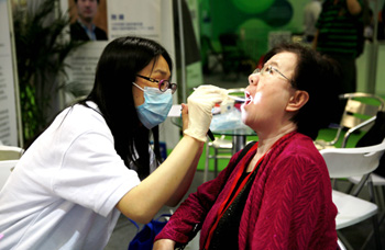 5月4日,一名參觀者(右)在第五屆中國國際養(yǎng)老服務(wù)業(yè)博覽會現(xiàn)場體驗醫(yī)療健康服務(wù)。 新華社記者 潘旭/攝? |