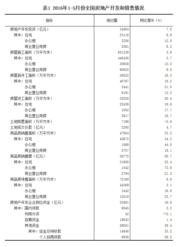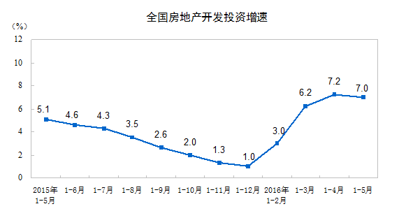 2016年1-5月份,全國房地產(chǎn)開發(fā)投資34564億元,同比名義增長7.0%,增速比1-4月份回落0.2個百分點(diǎn)。其中,住宅投資23118億元,增長6.8%,增速提高0.4個百分點(diǎn)。住宅投資占房地產(chǎn)開發(fā)投資的比重為66.9%。